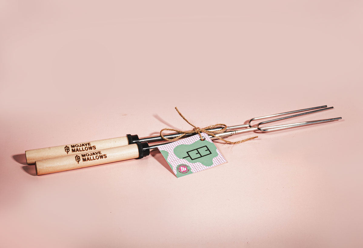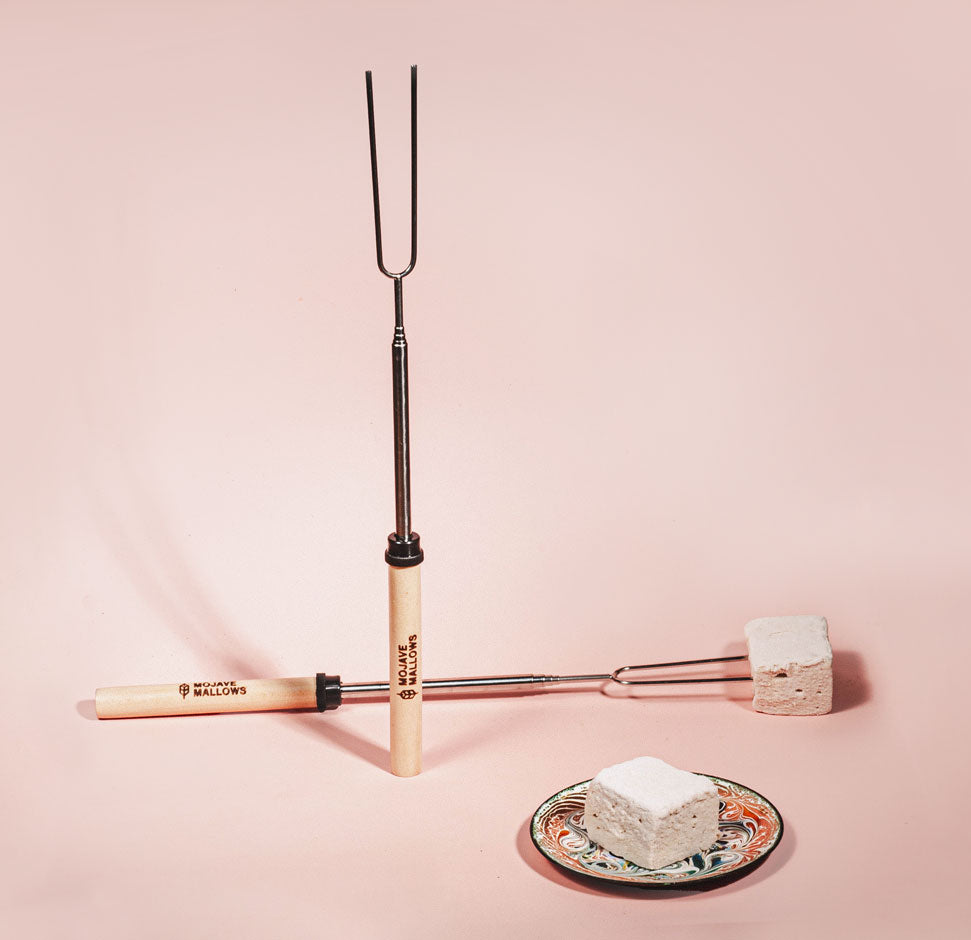 Our extendable marshmallow skewers are forked and can rotate for even roasting around the fire. They extend from 12 to 30 inches, keeping your marshmallows toasty and your eyebrows intact. Roasting sticks are made of stainless steel with an embossed wooden handle. Happy camping!