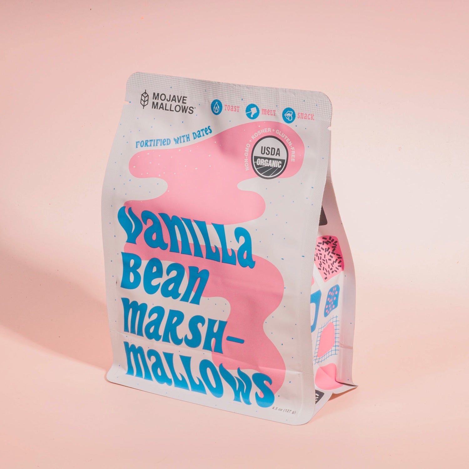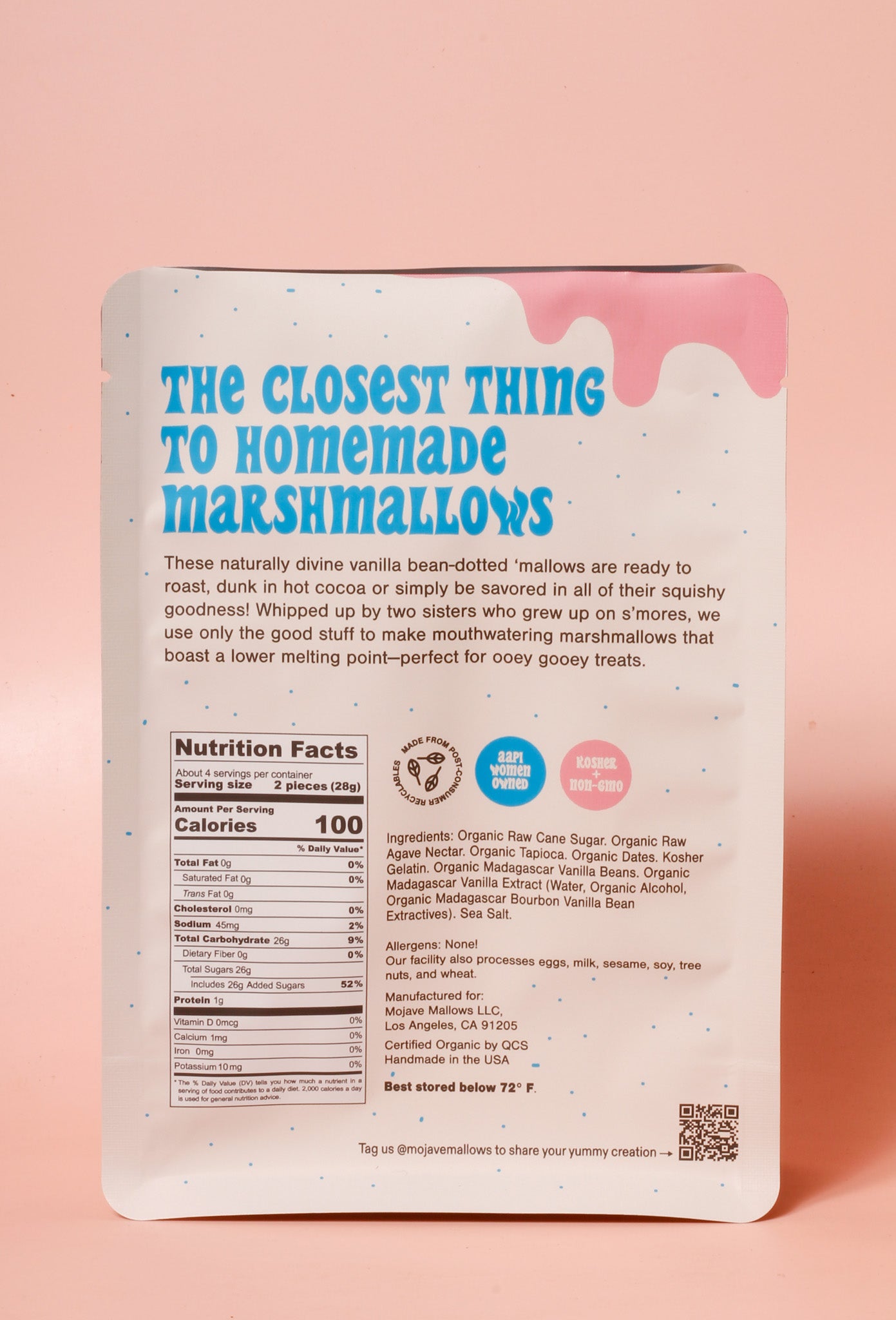 Organic marshmallows dotted with vanilla beans. The classic mallow for any occasion, and perfect for roasting s'mores or savoring in a melty cup of hot cocoa by the fire. Each individual marshmallow party pack is freestanding and resembles an artisanal coffee bag, fitting 4.5 ounces of hefty marshmallows -- size varies as these are a handmade snack!